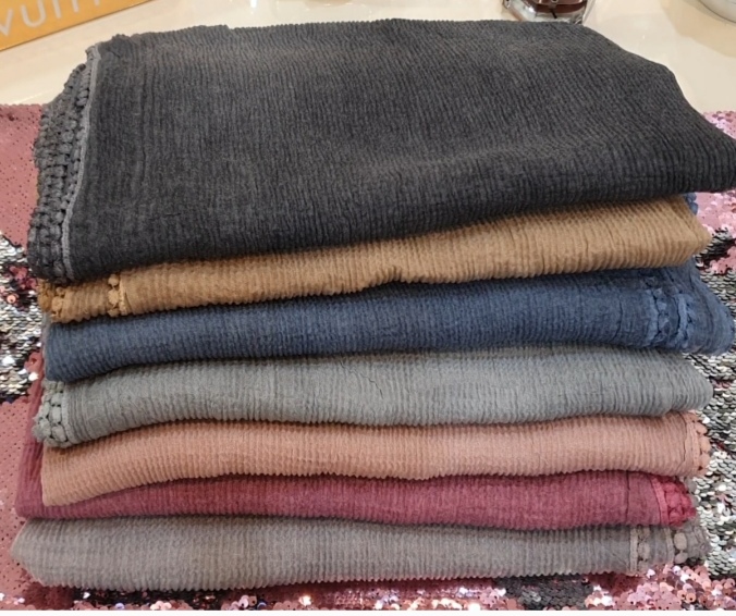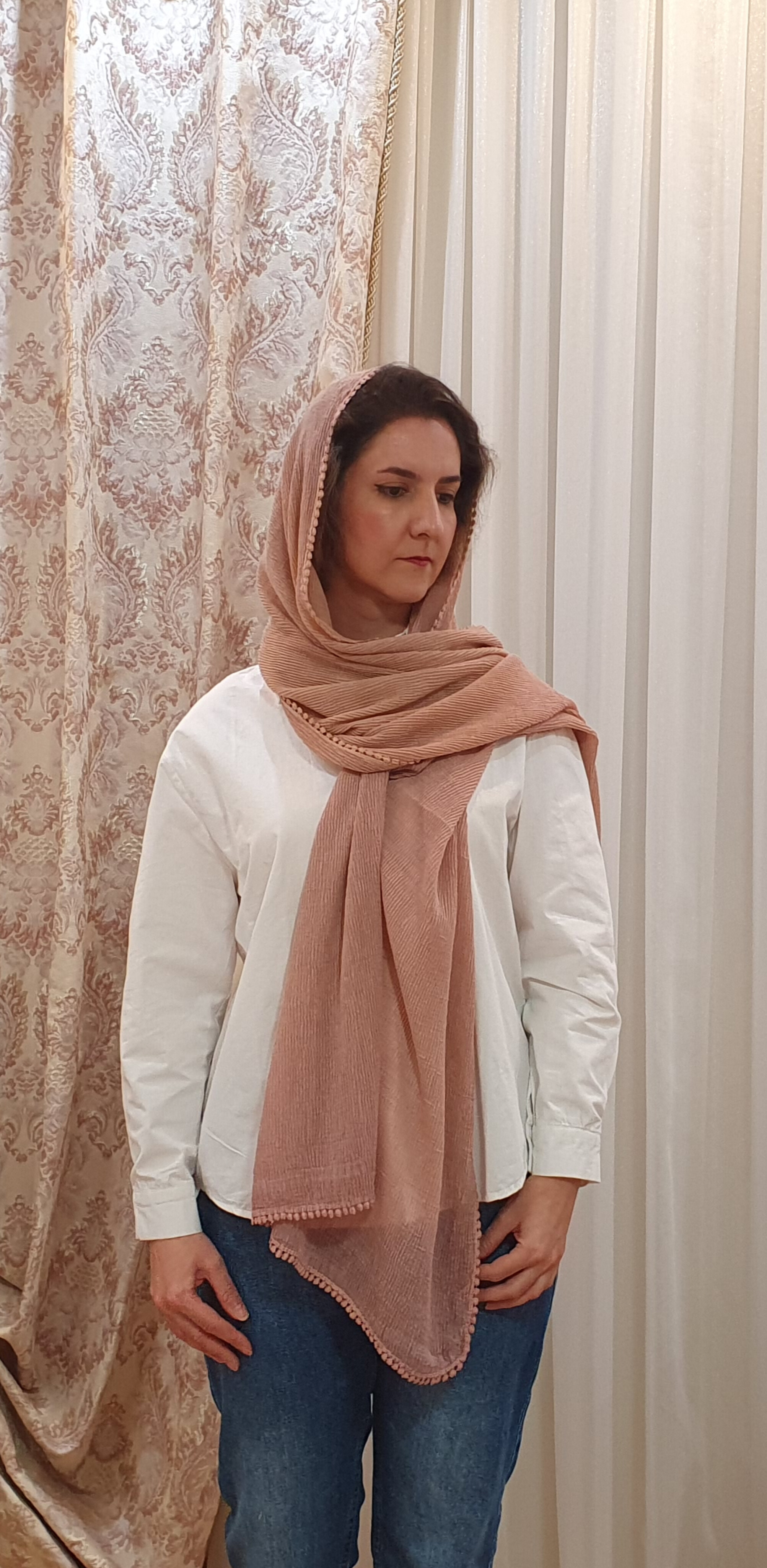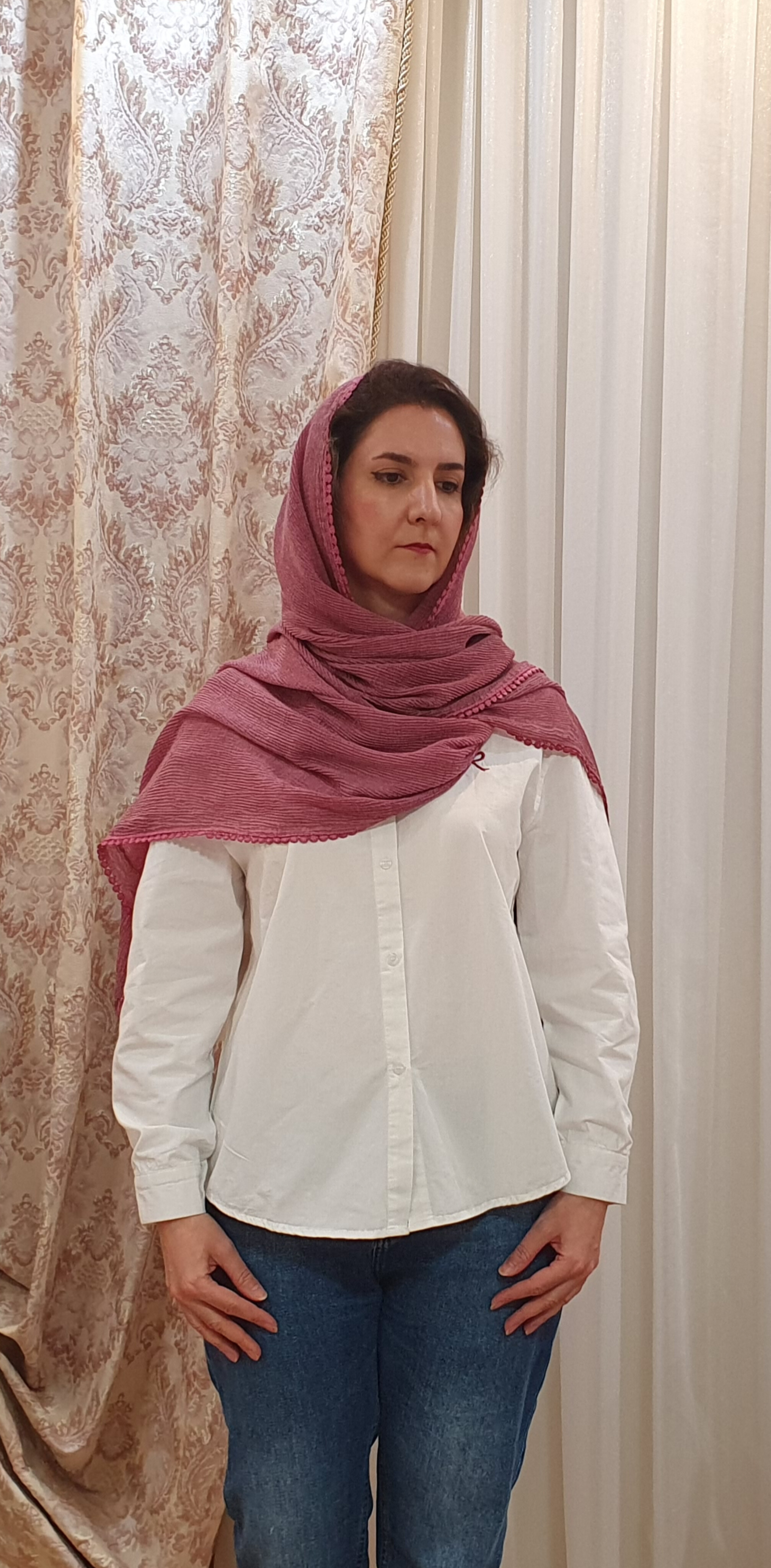 رنگ یاسی و گلبهی سر مدل میباشد دور شال دونه های کوچک میباشد که به این شال سنگشور دور عدسی میگویند جنس نرم و لطیفی دارد