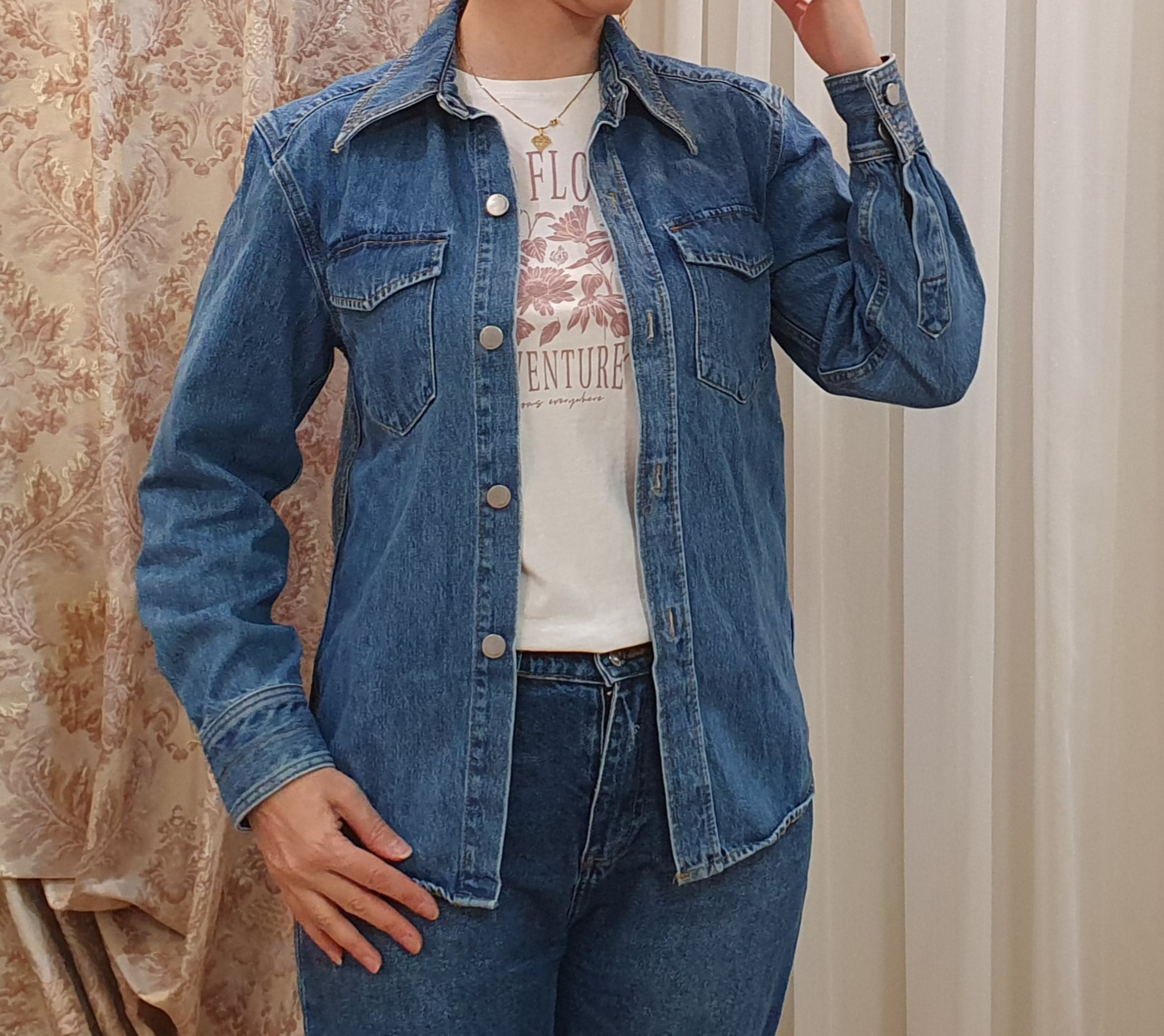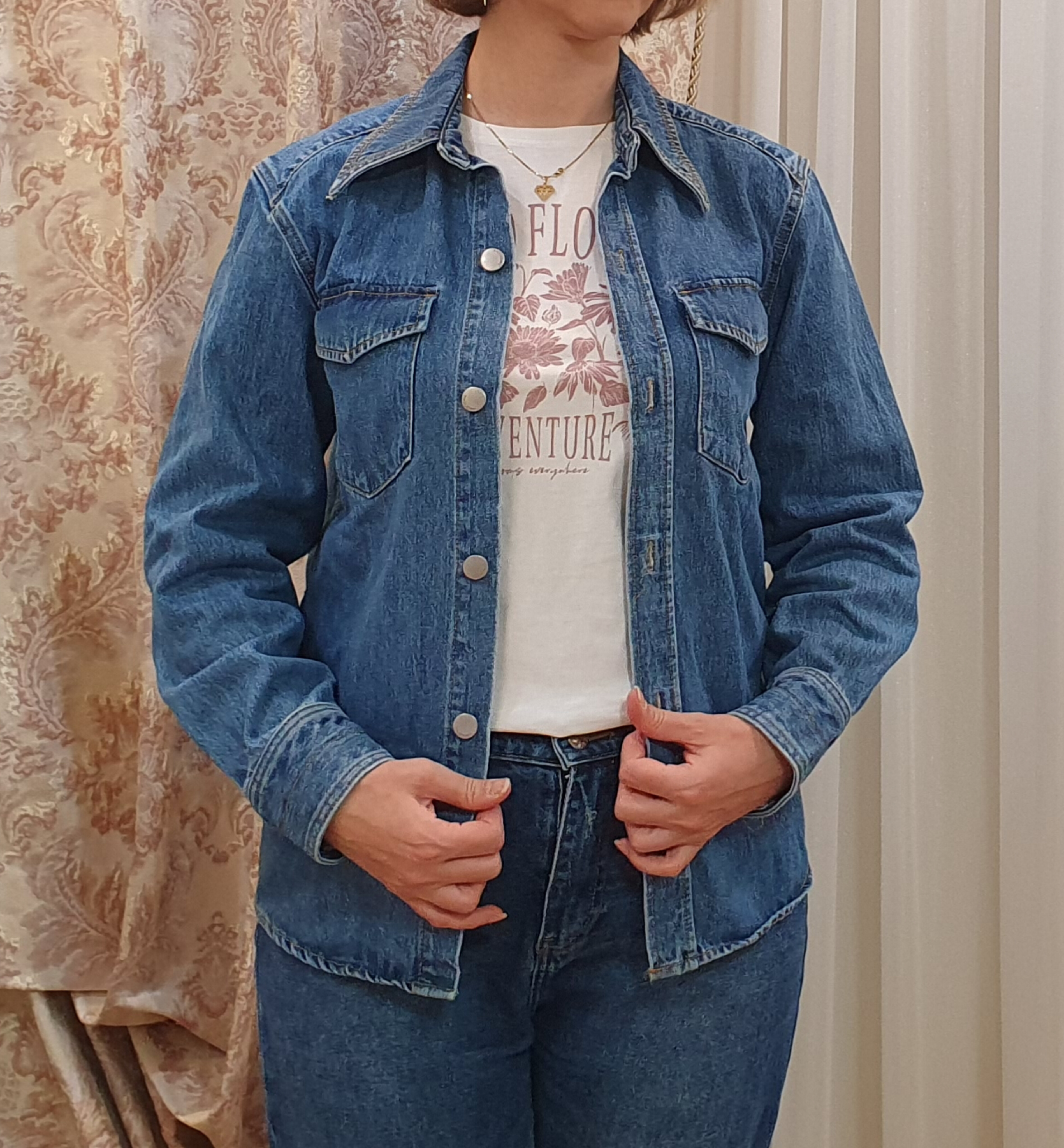 دو جیب روی کت موجود میباشد کت جین ضخیم نیست و چهار فصل میباشد سایز S عرض سینه 41 سانتی متر طول لباس 67 سانتی متر